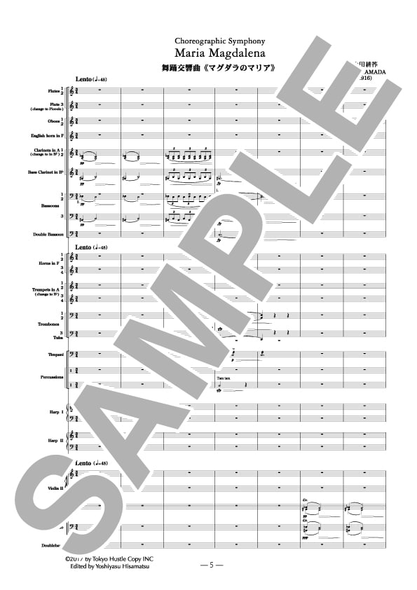 《マグダラのマリア》のスコアにはパントマイムの動きを模したような動と静の交錯などの他に、楽器別に強弱を変化させることで音色を変えたり、同音を楽器を変えて鳴らす「音色旋律」の技法が各所で駆使されている。管弦楽を想定してピアノ版を作成した作品には、先述の舞踊詩《青い焔》の他に、ピアノ組曲《源氏楽帖》などもあり、山田の作曲の通例上《マグダラのマリア》もまずはピアノ・スケッチが作成されている。しかし《青い焔》や《源氏楽帖》が作曲者のピアノで初演されているにもかかわらず、《マグダラのマリア》はピアノ版での上演に踏み切らなかったのは、こうした管弦楽ならではの仕掛けが多用されているからであろう。山田本人が「自分は“色彩家”である」と言ったように、彼は管弦楽作品ではもちろん、ピアノ曲や歌曲においても音から繊細な色彩を引き出すことに長けている。その中でも《マグダラのマリア》の色彩感はとりわけ見事である。管弦楽団でさえも黎明期であった日本で、これほどのスコアを書いた偉大な先達に心より感服すると同時に、最大限の敬意を表したい。また、長い間衆目に触れることのなかったこの傑作スコアを、手に取りやすいミニチュア・スコアという形で公開できることは大変喜ばしいことである。ぜひとも偉大な先達が描いた雄大な音絵巻に浸って頂きたい。