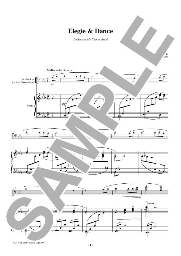 進化するユーフォニアム奏者、荒木玉緒氏の為に書いた作品。彼と一緒に某大学吹奏楽団の合宿に参加した際に「学生の前で1曲演奏しよう」と言うことで数時間で書かれました。前半のエレジーでは哀愁を帯びたメロディが展開され、短いカデンツァの後、アップテンポのダンスに入ります。途中エレジーのメロディも顔を出し、楽しい雰囲気のまま駆け抜けるように曲は終わります。技巧的な部分は少ないながら、見せ場もあり、親しみやすいメロディのポップな作品です。