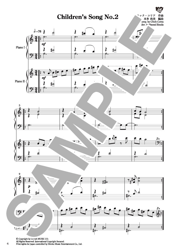 そんな大好きなチックコリアのチルドレンズ・ソングスをピアニストの小柳美奈子さんと一緒にデュオユニット70375(なおみなこ)で数年前から演奏しています。こども達の様々な表情が描かれているこの作品をたくさんの方達に演奏をしていただきたく、ソロとしても二台ピアノとしても演奏出来る楽譜を作りました。
